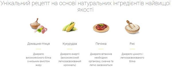 | Склад | М`ясне борошно з свійської птиці; Жир із свійської птиці; Кукурудза; Мал; Шкварки; Буряковий жом; Лососеве борошно; Кукурудзяний протеїн; Гідролізований білок із свійської птиці; Сушена печінка птиці; хлорид Калію; Мононатрійфосфат |