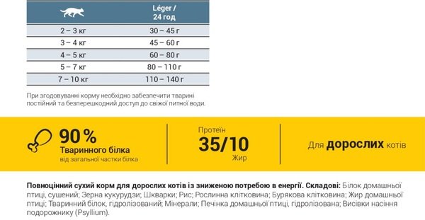 Josera léger містить знижений вміст енергії та збільшений вміст харчових волокон, тому є правильним харчуванням для котів із низьким рівнем активності або для таких, які, як правило, після кастрації схильні до ожиріння.