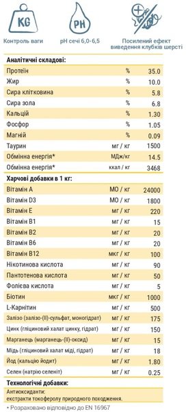 | Аналітичні компоненти | Протеїн % 35.0 Жир % 10.0 Сира клітковина % 5.8 Сира зола % 6.8 Кальцій % 1.30 Фосфор %1.05 Магній %0.09 Таурин мг/кг 1500 Обмінна енергія МДж/кг 14.5 Обмінна енергія ккал/кг 3468 |