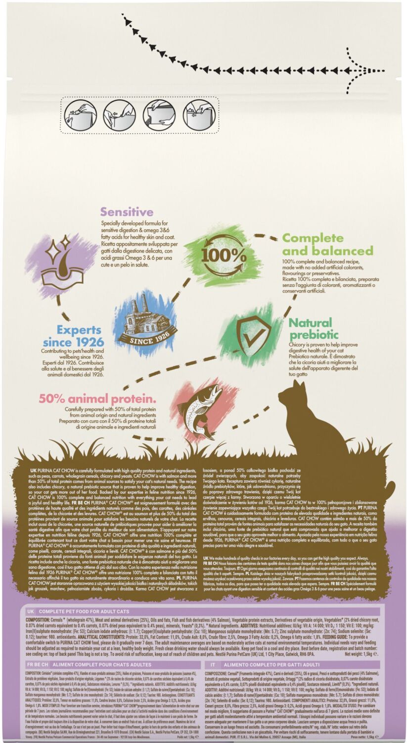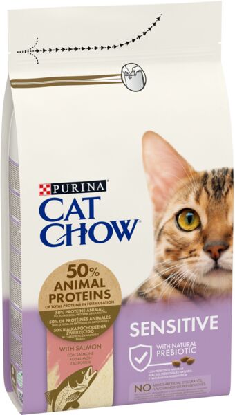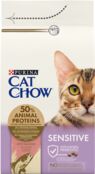- Сухий корм для дорослих котів Cat Chow Sensitive для чутливої шкіри та травлення з лососем 1,5кг