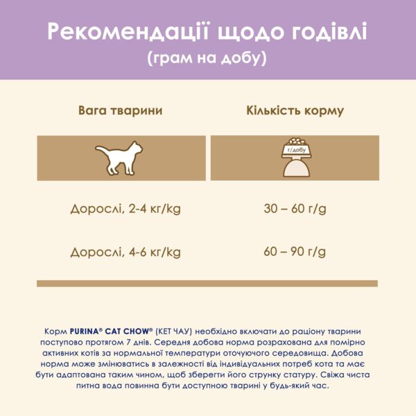 З 1926 року експерти Purina досліджували питання природних потреб домашніх улюбленців, щоб розробити повнораціонний корм, який підтримуватиме їх здоров’я та відмінне самопочуття. Щодня на наших фабриках ми робимо декілька сотень перевірок якості продукції, тож ви можете бути впевнені у якості, на яку ви очікуєте. Завжди. Формула сухого корму Cat Chow ретельно створювалася, аби 50% білків у складі були тваринного походження, а натуральні інгредієнти у складі продукту робили продукт ще більш апетитним та смачним.
