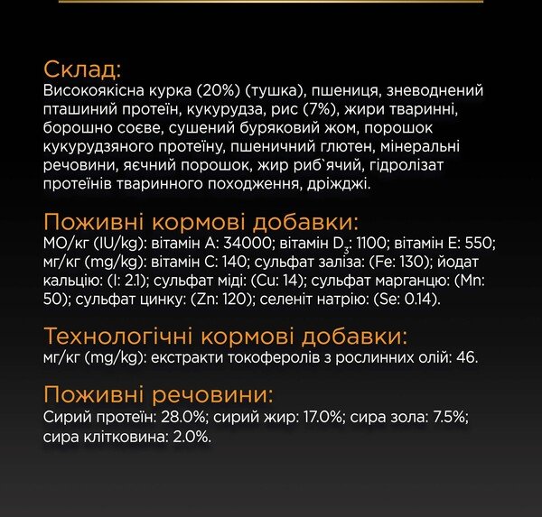 | Аналітичні компоненти | Сирий протеїн: 28.0%; сирий жир: 17.0%; сира зола: 7.5%; сира клітковина: 2.0% |