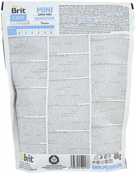 - Сухий корм для дорослих собак мініатюрних порід із чутливим травленням Brit Care Sensitive Grain Free 400г
