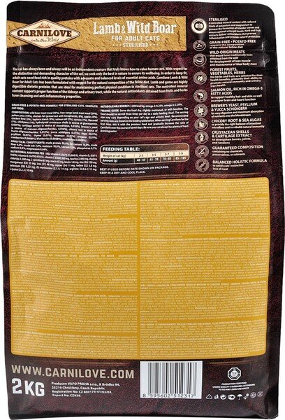 Аби зберегти відмінну форму, дорослим котам потрібна якісна білкова їжа зі збалансованим рівнем незамінних амінокислот. Carnilove Lamb & Wild Boar для дорослих котів розроблено з урахуванням природного раціону котів у дикій природі. Ягня і дичина містять легкозасвоюваний дієтичний білок, який ідеально підходить для підтримання відмінного здоров'я стерилізованих котів.