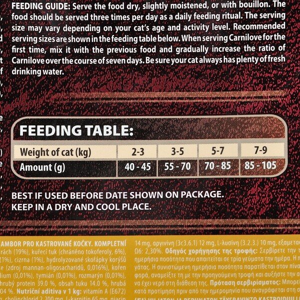 ХАРЧОВІ ПРИСАДИ В 1 КГ: вітамін A (3a672a) 23 000 МО, вітамін D3 (3a671) 940 МО, вітамін E (3a700) 650 мг, вітамін C (3a312) 300 мг, таурин (3a370) 2 400 мг, холіну хлорид (3a890) 2 200 мг, L-карнітин (3a910) 65 мг, ніацинамід (3a315) 45 мг, біотин (3a880) 1,8 мг, цинк (3b606) 150 мг, залізо (3b106) 48 мг, марганець (E5) 55 мг, йод (3b201) 3,8 мг, мідь (3b406) 11 мг, селен (3b810) 0,23 мг, L-метіонин (3c305) 14 мг, аргінін (3c3.6.1) 12 мг, L-лізин (3.2.3.) 10 мг.