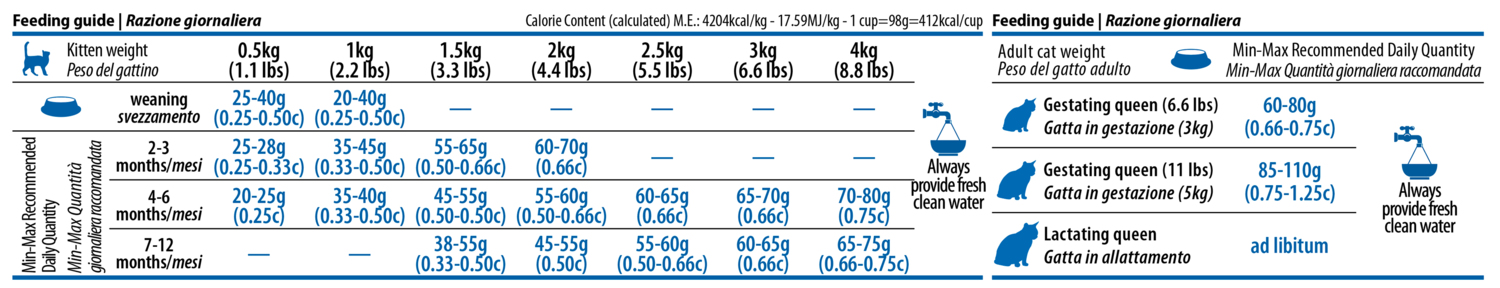 Рекомендована денна норма вказана у таблиці на упаковці. Під час переходу на ND рекомендується поступово замінювати попередній корм на новий. Для кішок протягом останніх двох тижнів вагітності та у період лактації годівля — на бажання. Завжди забезпечуйте тварині доступ до свіжої питної води. Зберігати в прохолодному, сухому місці, у закритій упаковці. Вироблено за 18 місяців до закінчення терміну придатності, вказаного на упаковці. Маса нетто, термін придатності, код партії та реєстраційний номер — дивіться на упаковці.