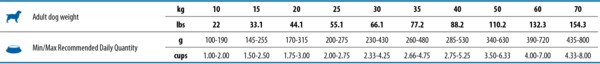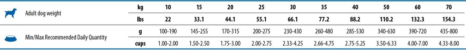 | Склад | Лосось (20%), дегідратований білок лосося (20%), спельта (12%), овес (12%), риб'ячий жир (з оселедця), дегідратований білок оселедця, висушений буряковий жом, висушена морква, борошно з люцерни, інулін, фрукто-олігосахариди, екстракт дріжджів (джерело маннан-олігосахаридів), сушений банан (0,5%), сушений ківі (0,5%), сушений манго (0,5%), сушена папая (0,5%), сушений ананас (0,5%), сушений шпинат, лушпиння і насіння подорожника, хлорид натрію, висушені пивні дріжджі, куркума, Екстракт алое вера, глюкозамін, хондроїтинсульфат |