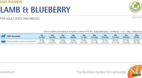 Ексклюзивна формула Farmina N&D Grain Free Pumpkin Adult Mini Lamb and Blueberry, що складається тільки з м'яса і без додавання злаків, які замінені овочами та свіжими фруктами, забезпечує необхідними поживними речовинами.