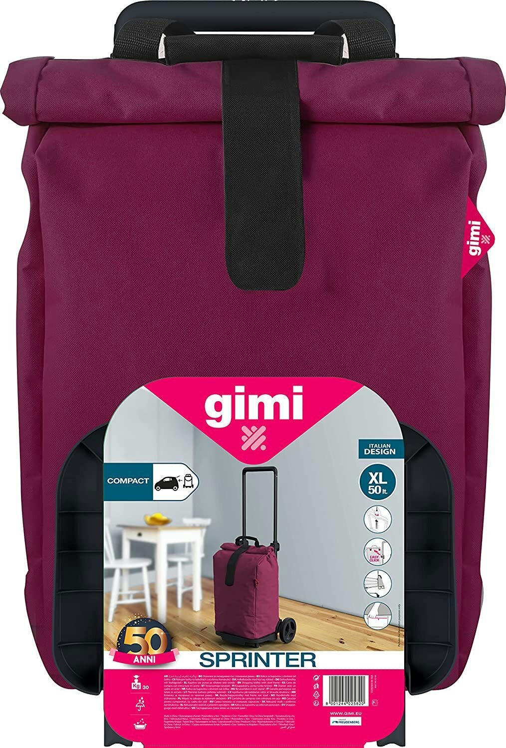 Сумка-візок Sprinter від італійської компанії Gimi - це елегантний та місткий аксесуар для шопінгу. Її об'єм становить 50 літрів, що дозволяє вмістити велику кількість покупок. Водостійка тканина та зручна горловина, що згортається, захищають вміст від вологи, пилу та бруду. Горловина закривається на застібку Velcro. Всередині сумки є кишеня-гаманець на блискавці для зберігання дрібних предметів. Колеса діаметром 15 см забезпечують легкість переміщення візка по торгових центрах, ринках та міських тротуарах. Ручка сумки розкладається за принципом телескопічної системи. Сумка легко знімається з каркасу шасі завдяки системі Easy-click, що дозволяє транспортувати на базовому шасі вантажі різної форми вагою до 30 кг. Платформа також легко складається для зручного зберігання або транспортування в автомобілі.