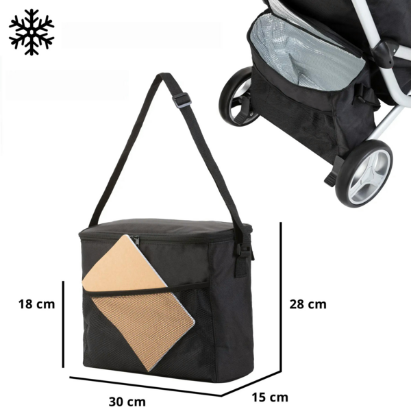 - Ізотермічна сумка знімається або закріпляється на шасі за допомогою текстильної застібки. Розміри 30x28x15 см. З наплічним ременем можливо використовувати як окрему сумку.