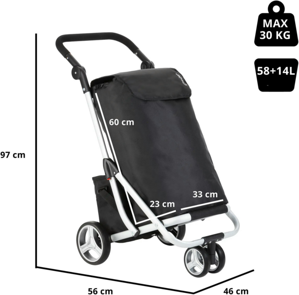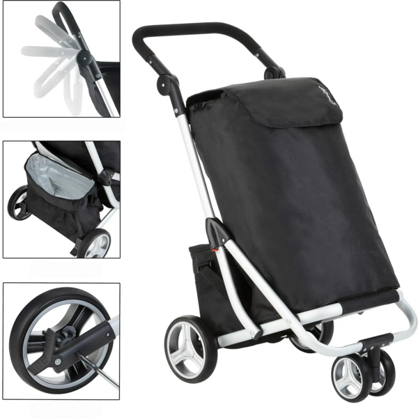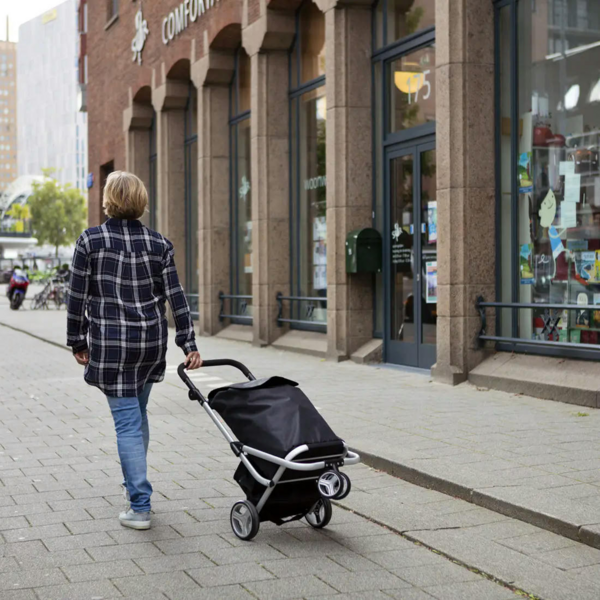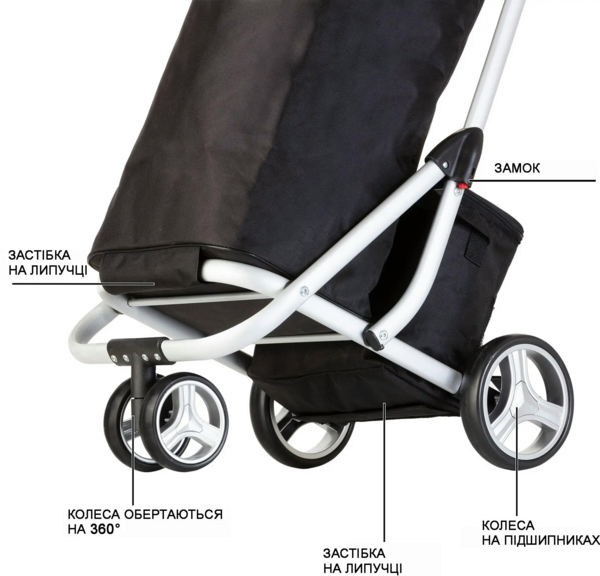 Сумка-візок ShoppingCruiser 3 Wheels Black втілює в собі легкість, міцність, стійкість, компактність. Триколісна система забезпечує стабільність і маневреність, а також можливість везти візок попереду вас. Конструкцією шасі передбачено триточкову опору коліс, завдяки чому сумка-візок стійка та може служити користувачеві додатковою опорою при пересуванні. Передня пара коліс діаметром 12 см має можливість незалежного розвороту на 360°, що дозволяє легко маневрувати під час руху.