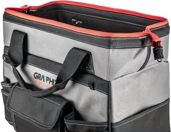 Середня сумка для електроінструментів Energy + GRAPHITE, місткість 18,5 л, виготовлена з поліестеру. Сумка оснащена 8 внутрішніми кишенями, 2 внутрішніми петлями для інструментів і 7 зовнішніми кишенями, що дозволяє організувати ваші інструменти і їх безпечне транспортування.