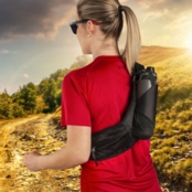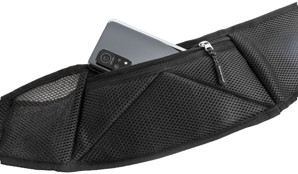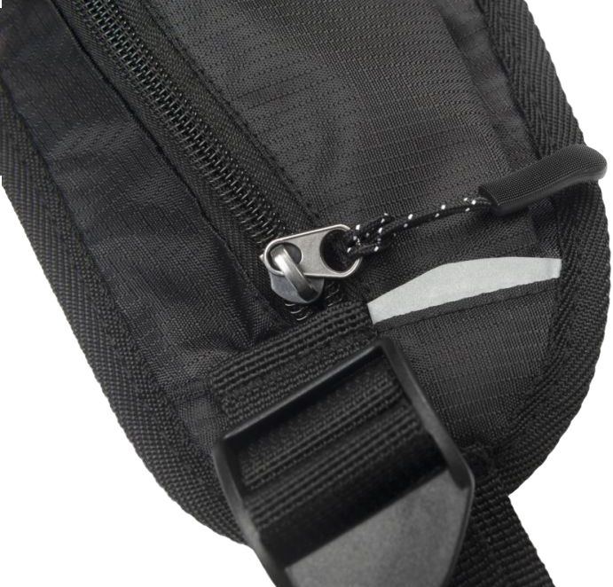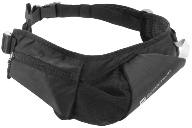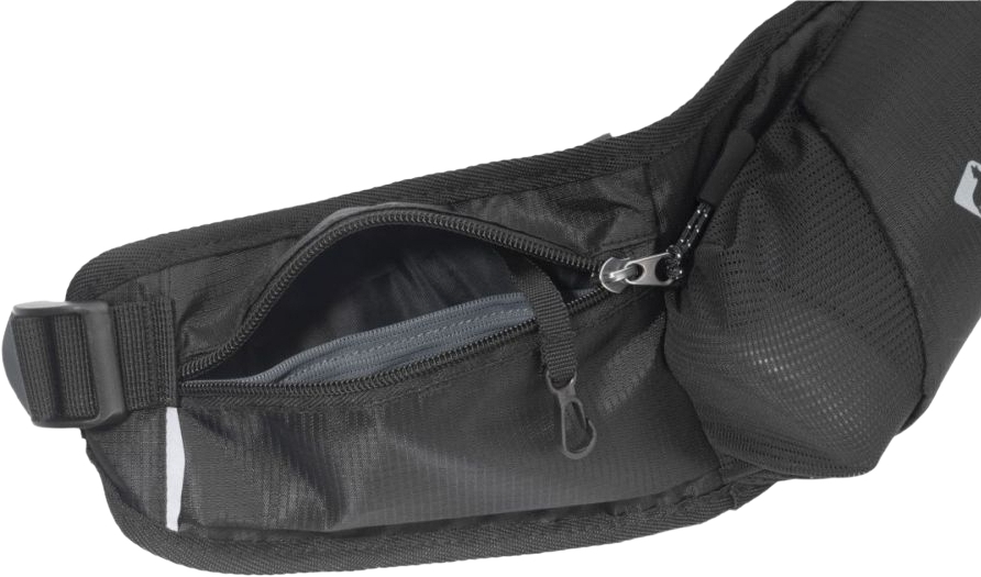 - Сумка на пояс містить велику передню кишеню для спортивної пляшки, невелику передню кишеню на блискавці для кредитної картки та задню кишеню на блискавці розміром 19x10 см для мобільного телефону;
