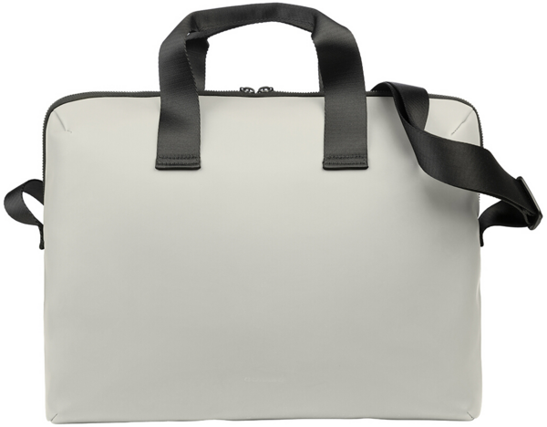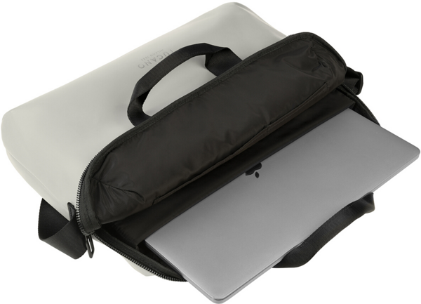 Сумка з мінімалістично-спортивним дизайном для 15,6-дюймового ноутбука та 16-дюймового MacBook, виготовлена з прогумованого матеріалу. Має одне велике відділення з внутрішнім відсіком для ноутбука та зовнішнє відділення для аксесуарів.
