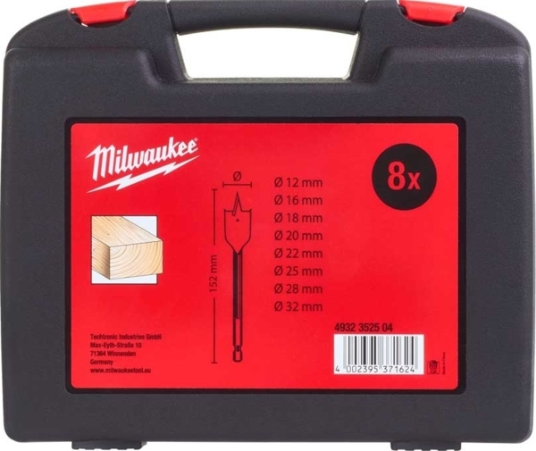 Свердло по дереву перове Milwaukee, набір 8шт, 12-32мм, шестигранний хвостовик, кейс (4932352504)