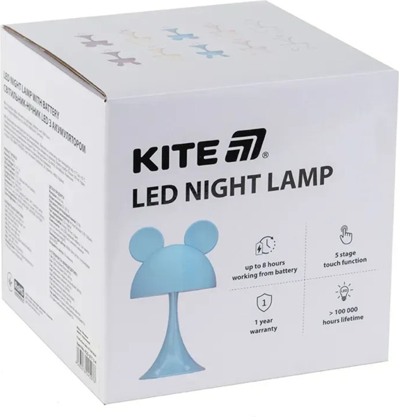 Світильник-нічник LED Kite з акумулятором прикрасить дитячу спальню. Нічник з вухами милого звірятка, що світиться, допомагатиме дитині легше засинати. Його м’яке розсіяне світіння дуже комфортне для очей та не заважає сну. Оснащений вбудованою літієвою батареєю місткістю 1200 мАг, яка дозволяє безперервно користуватися нічником до 8 годин. Заряджається за допомогою USB-кабелю. Без адаптера в комплекті.