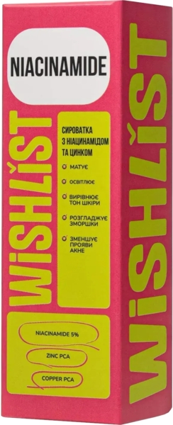 - Ніацинамід 5%: нормалізує секрецію шкірного сала, зменшує розширені пори і освітлює пігментні плями;