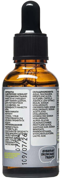 | Склад | Aqua, Niacinamide, Propylene Glycol, Glycerin, Centella Asiatica Leaf Extract, Inulin, Sodium Hyaluronate crosspolymer, Sodium Hyaluronate, Sodium Acetylated Hyaluronate, Hydrolyzed Sodium Hyaluronate, Alpha-glucan oligosaccharide, Pentylene Glycol, Xanthan Gum, Sodium Benzoate, Phenoxyethanol, Ethylhexylglycerin, Lactic Acid |