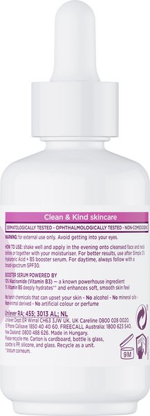 Сироватка Simple Вітамін В3 + Ніацинамід – це відновлюючий засіб, 88% компонентів якого мають натуральне походження. Вона допомагає утримувати вологу, зміцнює захисний бар'єр шкіри, вирівнює тон і текстуру, зменшує почервоніння та мінімізує розширені пори.