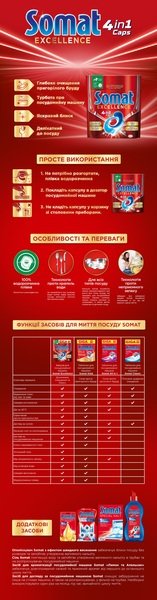 - Капсули Somat Екселенс 4-в-1 - це швидкорозчинні капсули, що складаються з порошку та трьох унікальних гелів у водорозчинній плівці.