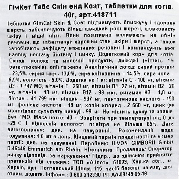 - Таблетки Gimborn Every Day Skin&Coat для котів 40 г