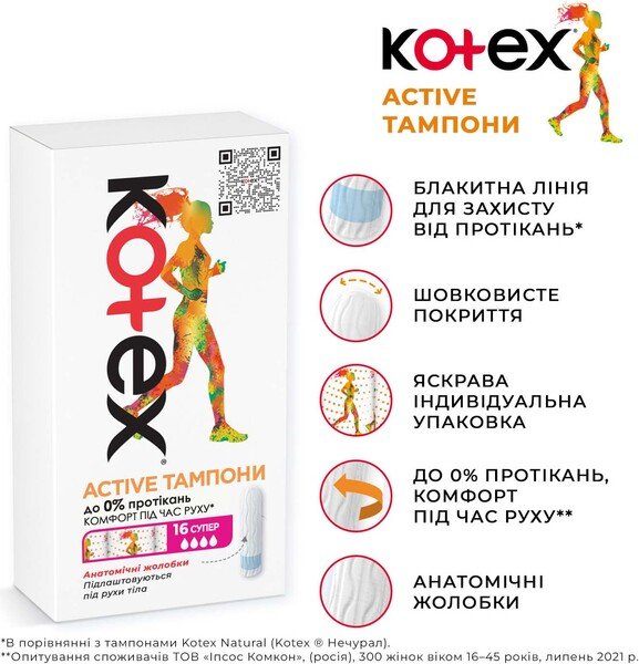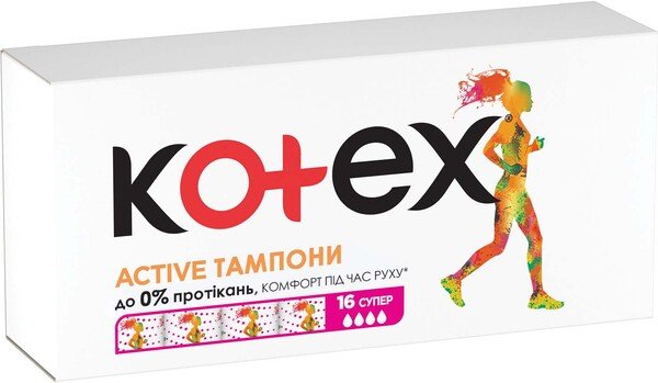 Завдяки додатковим різноспрямованим жолобкам та блакитній лінії захисту нові тампони Kotex Active швидко вбирають рідину та захищають під будь-яким кутом.