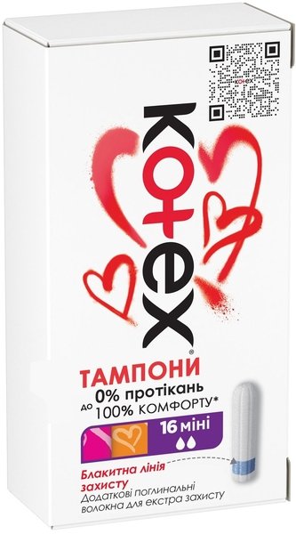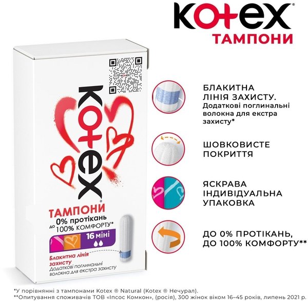 Завдяки поверхні SilkyCover гарантується максимально комфортне введення, а гідрофільні волокна UltraSorb швидко вбирають вологу. Спеціальна блакитна зона складається з суперпоглинаючих волокон UltraSorb, вона швидко вбирає вологу, утримує її всередині та забезпечує надійний захист від протікань. Унікальна система відкриття "прокрути і відкрий" дає змогу використовувати тампони Kotex у будь-яких умовах.