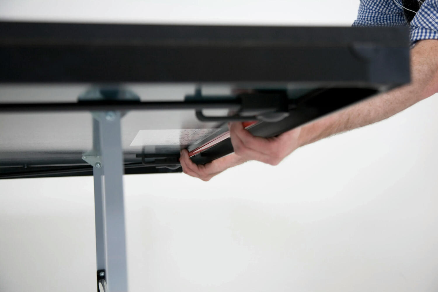 - Система розблокування SMS (Smart Manual System) дозволяє легко скласти стіл за допомогою ручки, розташованої під стільницею.