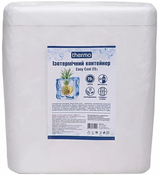 Термобокс Thermo Easy Cool 25 л - оптимальна альтернатива традиційним пластиковим термобоксам. При об'ємі 25 л контейнер важить всього - 570 гр і здатний зберігати холод протягом 14 годин з акумуляторами холоду. Товщина стінок контейнера: 38 мм. Матеріал полістирол "Альфопор" володіє чудовими теплоізоляційними та звукоізоляційними властивостями, високою стійкістю до ударів, вібростійкістю, світлостійкістю, водо- і пилонепроникністю, міцністю при фізичній обробці. Матеріал стійкий до гідролізу, жирів, кислот, розчинів лугів і кислот.
