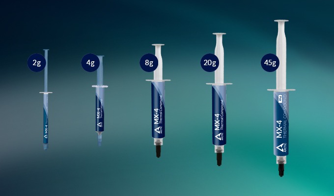 ARCTIC MX-4 доступний у розмірах від 2 до 45 грамів. Упаковка, що закривається, запобігає висиханню пасти.