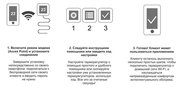 Додаток DEVIsmart App дозволяє вам з легкістю управляти системою теплої підлоги з будь-якої точки планети. Завдяки таким функціям інтелектуального додатки, як захист від замерзання, тижневий графік програмування, режими «У від'їзді» і в «У відпустці», економічний режим, можна миттєво змінювати програму теплої підлоги, підлаштовуючи її під свій розпорядок дня і скорочуючи витрати на електрику. Ви будете в курсі змін в роботі системи завдяки оповіщення і попереджень на вашому мобільному пристрої.