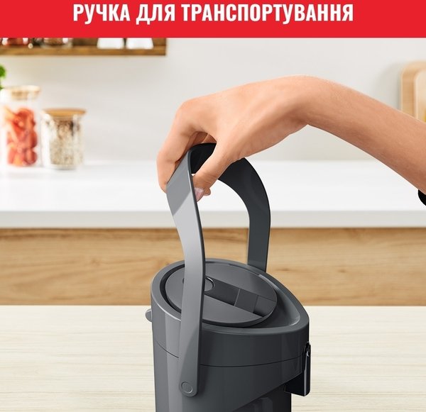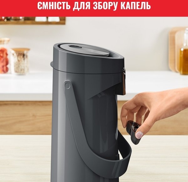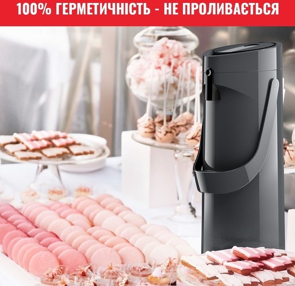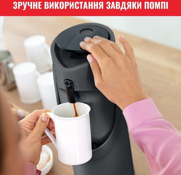 Завдяки продуманому і сучасному дизайну термос забезпечує максимальний комфорт для наповнення і подачі напоїв, а також ідеально підійде для будь-якого випадку. Термос простий і зручний у використанні, а завдяки технології Comfort Press - він максимально комфортний і ергономічний. Удосконалена технологія ізоляції підтримує оптимальну температуру напоїв: до 12 годин - для гарячих напоїв і до 24 годин - для холодних напоїв. Великий об'єм помпи продуманий для зручності під час наливання, щоб щоразу радувати вас смачними гарячими напоями ідеальної температури. Завдяки простоті в очищенні та зручності в транспортуванні, універсальній великій місткості 1,9 л і простому процесу наповнення, термос стане в пригоді на всі випадки життя - для зручної подачі улюблених гарячих напоїв.