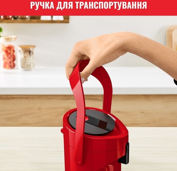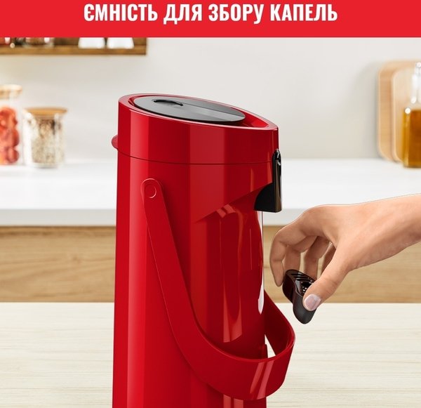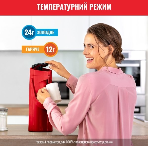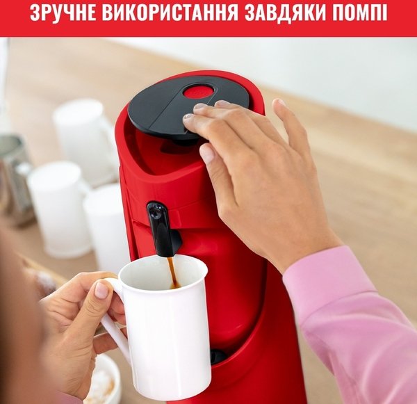 Завдяки продуманому і сучасному дизайну термос забезпечує максимальний комфорт для наповнення і подачі напоїв, а також ідеально підійде для будь-якого випадку. Термос простий і зручний у використанні, а завдяки технології Comfort Press - він максимально комфортний і ергономічний. Удосконалена технологія ізоляції підтримує оптимальну температуру напоїв: до 12 годин - для гарячих напоїв і до 24 годин - для холодних напоїв. Великий об'єм помпи продуманий для зручності під час наливання, щоб щоразу радувати вас смачними гарячими напоями ідеальної температури. Завдяки простоті в очищенні та зручності в транспортуванні, універсальній великій місткості 1,9 л і простому процесу наповнення, термос стане в пригоді на всі випадки життя - для зручної подачі улюблених гарячих напоїв.