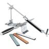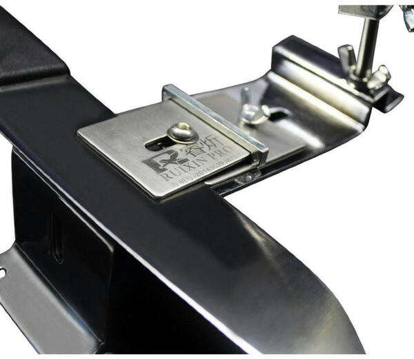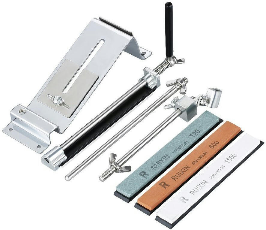 Модель Ruixin RX 003 — виконана з металу, хоч і не з нержавіючої сталі, а з нікельованого заліза. Основу точилки можна прикрутити до стільниці болтами або просто поставити на стіл і утримувати рукою під час роботи. Точильний верстат збирається з декількох деталей, тому в розібраному вигляді він дуже компактний і зручний для транспортування. У комплект входять чотири точильні камені, кожен із яких закріплений на пластиковій підкладці. Їх досить швидко можна закріпити на напрямній та по черзі змінювати для досягнення найкращого результату.