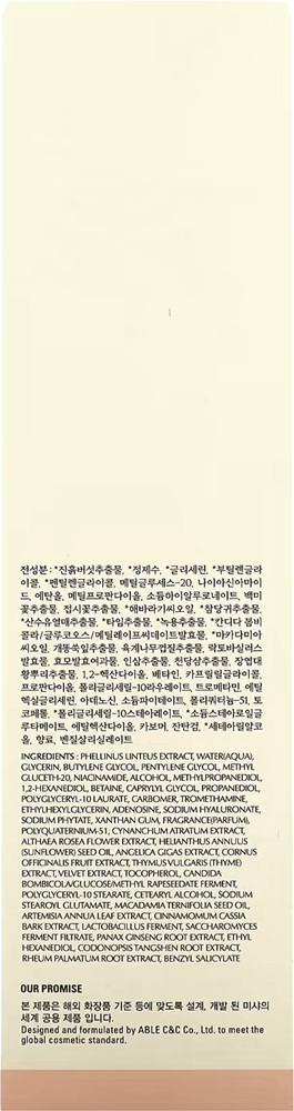 | Склад | Phellinus linteus extract, purified water, glycerin, butylene glycol, pentylene glycol, methyl gluceth-20, niacinamide, ethanol, methylpropanediol, sodium hyaluronate, vincetoxicum atratum extract, althaea rosea flower extract, helianthus annuus (sunflower) seed oil, angelica gigas root extract, cornus officinalis fruit extract, Rheum palmatum root/stalk extract, 1,2-hexanediol, betaine, caprylyl glycol, propanediol, polyglyceryl-10 laurate, tromethamine, ethylhexylglycerin, adenosine, sodium phytate, polyquaternium-51, tocopherols, polyglyceryl-10 stearate, sodium stearoyl glutamate, ethyl hexanediol, carbomer, xanthan gum, cetearyl alcohol, fragrance, benzyl salicylate, Thymus vulgaris extract, velvet extract, candida bombicola/glucose/methyl rapeseedate ferment, macadamia ternifolia seed oil, artemisia annua extract, cinnamomum cassia bark extract, lactobacillus ferment, saccharomyces ferment filtrate, panax ginseng root extract, codonopsis tangshen root extract |
