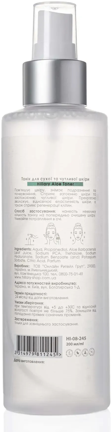 - Тонік Hillary Aloe Toner для сухої та чутливої шкіри 200 мл