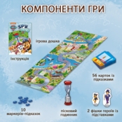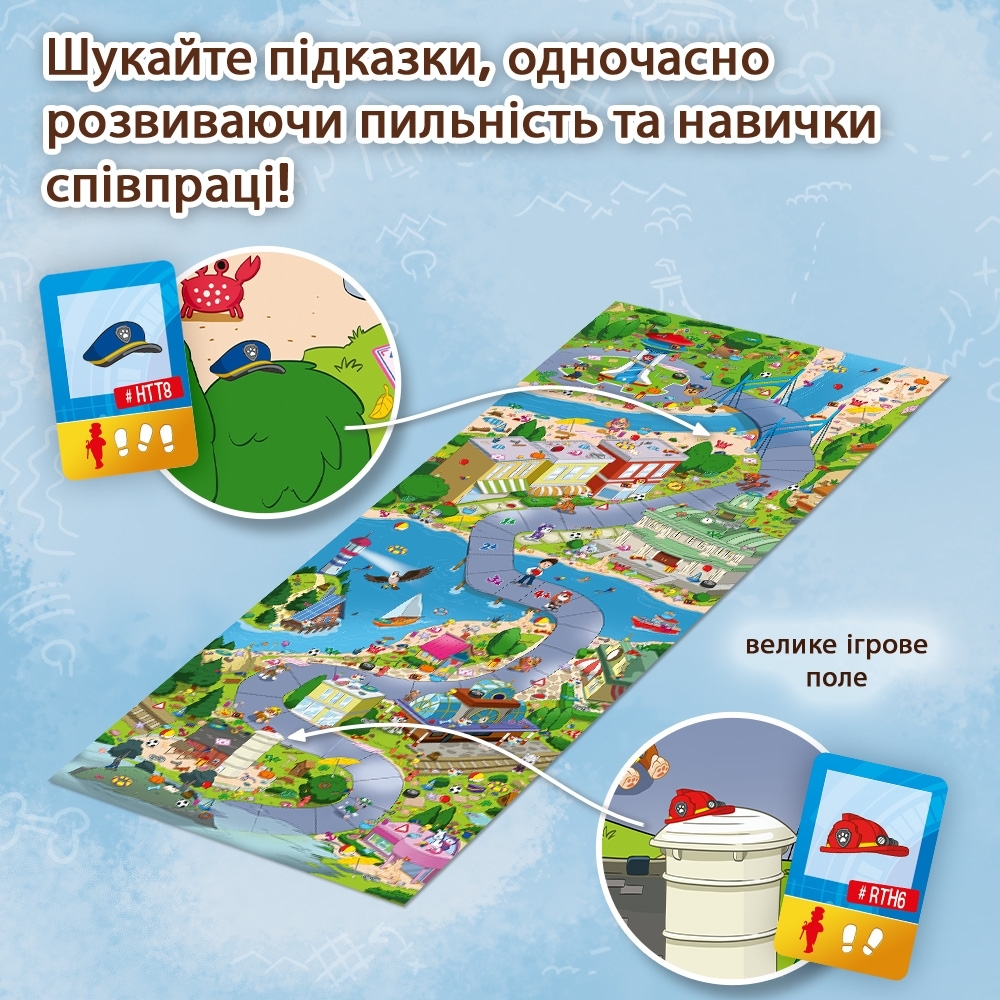 Кожен елемент гри створений з любов'ю до деталей та турботою про юних гравців. Відкривши коробку, ви знайдете: величезне ігрове поле довжиною 111 см із яскравими та докладними ілюстраціями; 56 карт-підказок, які спрямують вас на правильний шлях; 10 маркерів, щоб фіксувати знахідки; 2 ігрові фішки з підставками для пересування по полю; пісочний годинник, що додає елемент азарту в гру. Великі зручні деталі спеціально розроблені для маленьких ручок, а барвисті зображення захоплять не тільки дітей, а й дорослих. Це гра, де кожен зможе проявити свої найкращі якості – від пильності до стратегічного мислення! Щеняча команда кличе до гри! Це не просто настільна гра, а цілий світ, де гравці стають справжніми героями. Майже метрова дошка з десятками дрібних деталей перетворюється на справжнє поле для досліджень. Знаходьте сховані підказки, обговорюйте знахідки з командою, розподіляйте ролі та дійте як єдине ціле! Цю настільну гру варто придбати для сімейних вечорів: маленькі гравці зможуть розвинути уважність та спостережливість, а дорослі насолодяться цікавим сюжетом та кооперативним духом. Час, проведений за грою, зближує, створює унікальні спогади та дарує багато посмішок.