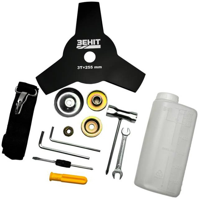 | Комплектація (можливі зміни в різних поставках) | Гвинт кріплення – 4 шт., Документація, Ємність для приготування паливної суміші, Захисний кожух, Інструмент для збирання, Ключ, Викрутка, Плечовий ремінь, Трилопатевий ніж, Тример, Шестигранний ключ – 2 шт. |