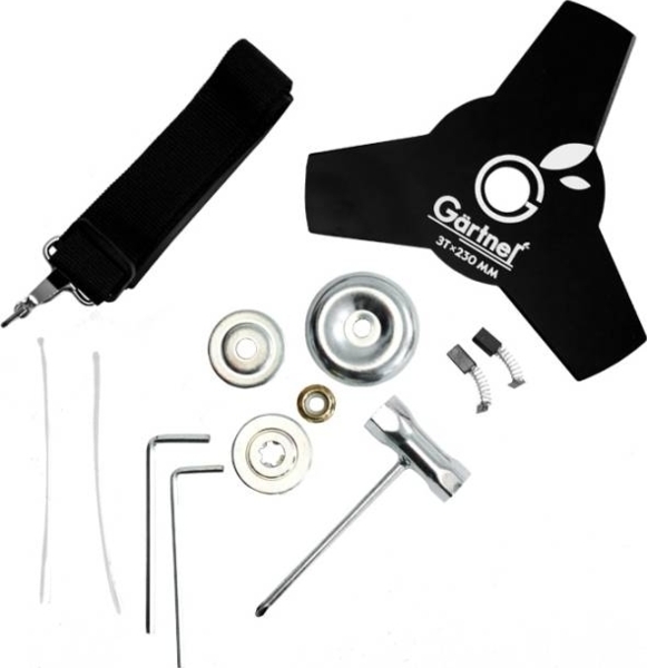 | Комплектація (можливі зміни в різних поставках) | Документація, Захисний кожух, Котушка з волосінню, Комплект кріпильних елементів, Набір інструментів, Ніж, Плечовий ремінь, Рукоятка, Тример |