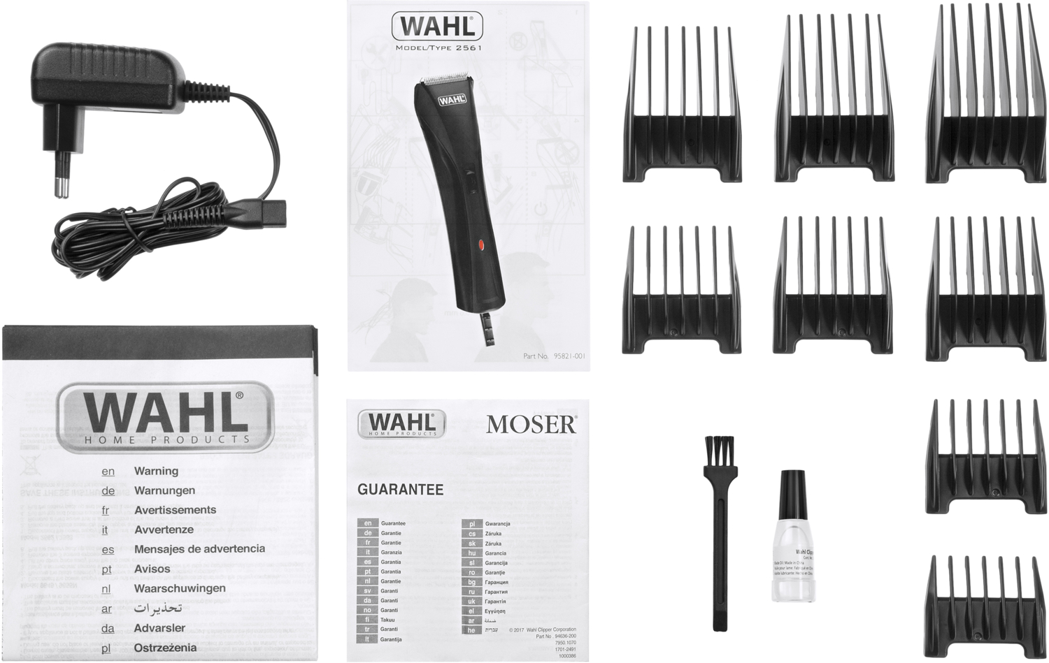 | Комплектація (можливі зміни в різних поставках) | Документація, Зарядний пристрій, Кейс, Олія, Насадка – 8 шт., Тример, Щіточка для чистки |