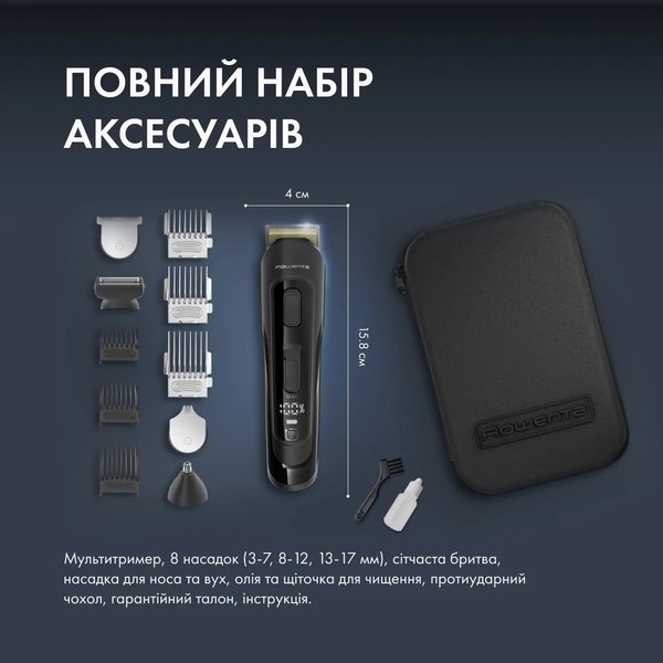 Rowenta Selectium 12 в 1 має 32 рівні довжини від 0.5 до 17 мм та 6 регульованих насадок-гребнів (3 для бороди та 3 для волосся) з точним кроком 0.5 мм.