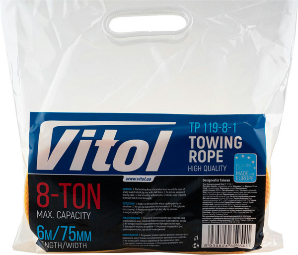 - Трос буксирувальний Vitol 8т 75мм * 6м 2 гака Помаранчевий (ТР-119-8-1)
