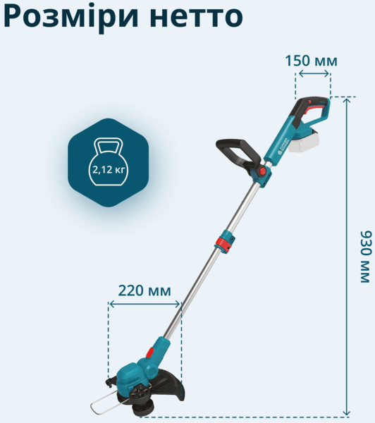 | Комплектація (можливі зміни в різних поставках) | Документація, Захисна скоба, Захисний щиток, Колесо – 2 шт., Тример, Шпуля з волосінню |
