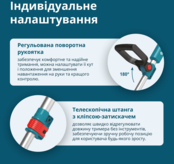 Дозволяє змінювати кут нахилу для зручного тримання та кращого контролю під час роботи. Завдяки цьому інструмент легко адаптується до різних завдань та вподобань користувача.