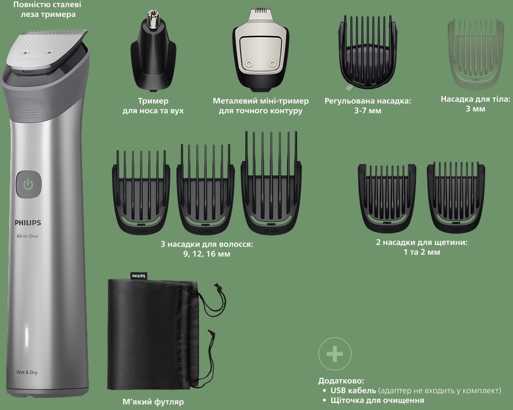 | Насадки | Гребінець 12 мм, Гребінець 9 мм, Гребінь для волосся 16 мм, Для вух та носа, Насадка 1 мм, Насадка 3 мм, Насадка для щетини 1 мм, Насадка для щетини 2 мм, Регульований гребінь 3-7 мм |