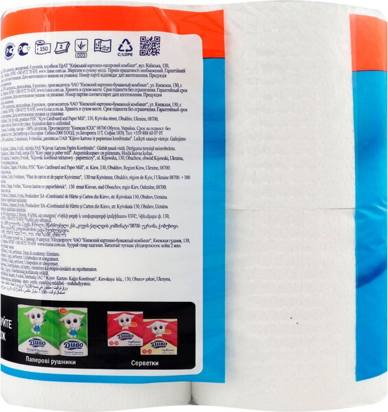 Папір виготовлений зі 100% целюлози, тому він м'який, міцний і вбирає вологу без залишку. Двошарова структура забезпечує додаткову міцність і дозволяє використовувати папір для різних цілей.