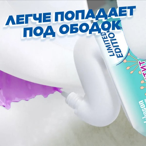 ВБИВАЄ 99,9% МІКРОБІВ, а також усуває неприємні запахи й дарує свіжий аромат. Завдяки унікальній формі шийки пляшки краще потрапляє у важкодоступні місця скупчення бактерій під обідком унітаза. Продукт має потужну формулу із високою концентрацією активних компонентів. Вони розчиняють стійкий наліт та очищають поверхню від залишків бруду, усувають неприємні запахи. Також ці речовини руйнують оболонку бактерій та повністю знезаражують унітаз. Завдяки особливій технології продукт працює навіть у воді.
