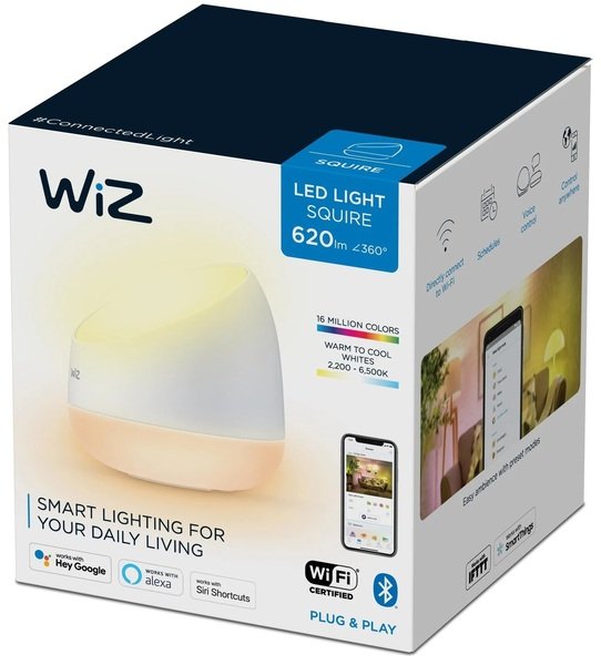 Організуйте інтелектуальне освітлення в будь-якому місці вашої кімнати за допомогою настільної лампи WiZ Squire, що розсіює на стіни яскраве світло. Використовуйте лампу з додатком WiZ або свій голос, щоб знизити або збільшити яскравість, або скористайтеся попередньо встановленими режимами освітлення в розділі налаштувань мережі Wi-Fi.