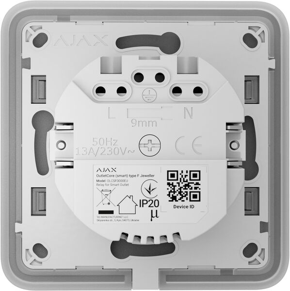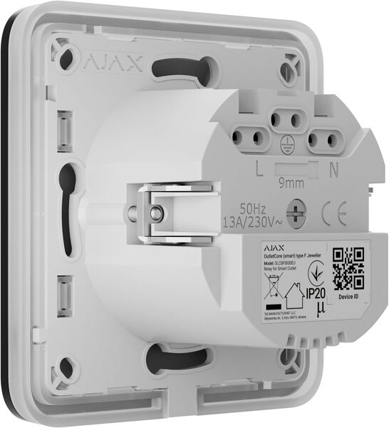 Outlet [type F] Jeweller - це розумна вбудована розетка з функцією моніторингу споживання електроенергії. Керувати її роботою можна дистанційно через мобільний застосунок Ajax.