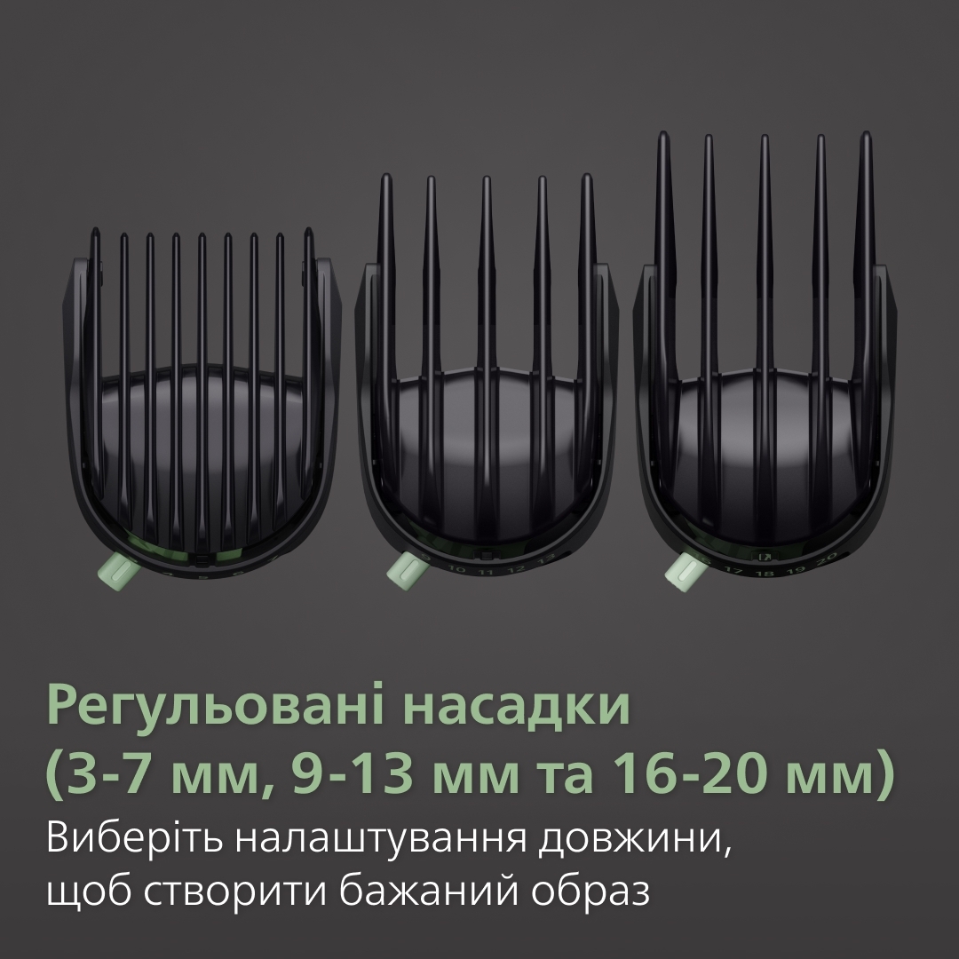 | Насадки | Бритвенна , Гребінець 1 мм, Гребінець 12 мм, Гребінець 3 мм, Гребінь 4 мм, Гребінець 5 мм, Гребінець 6 мм, Гребінець 9 мм, Гребінь SkinProtect, Для вух та носа, Регульований гребінь 1-3 мм, Регульований гребінь 16-20 мм, Регульований гребінь 3-7 мм, Регульований гребінь 9-13 мм, Тример |